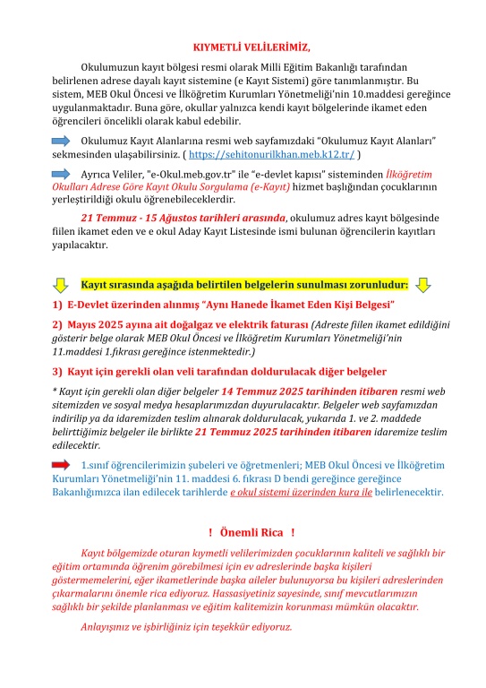 Kayıt bölgemizde oturan kıymetli velilerimizden çocuklarının kaliteli ve sağlıklı bir eğitim ortamında öğrenim görebilmesi için ev adreslerinde başka kişileri göstermemelerini, eğer ikametlerinde başka aileler bulunuyorsa bu kişileri adreslerinden çıkarmalarını önemle rica ediyoruz. Hassasiyetiniz sayesinde, sınıf mevcutlarımızın sağlıklı bir şekilde planlanması ve eğitim kalitemizin korunması mümkün olacaktır.