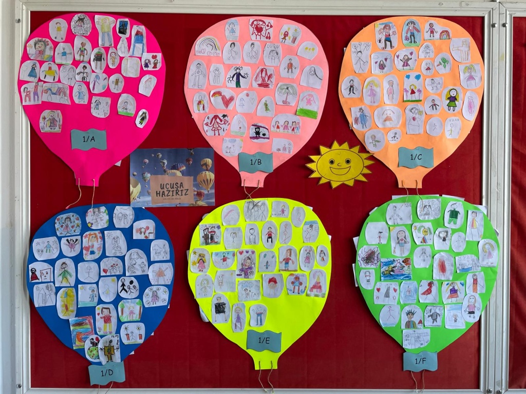 Dersimizin sonunda; her bir sınıfımıza ait uçan balon oluşturacağımız ve yıl boyunca bu balonda dolaşıp güzel bilgiler öğreneceğiz vurgusu yapılarak, öğrenilerimizden kendilerini çizmeleri istendi. Öğrencilerimizin kendilerini çizmiş oldukları resimlerden oluşan sınıf balonlarımızı hazırlandı ve panomuz oluşturuldu.